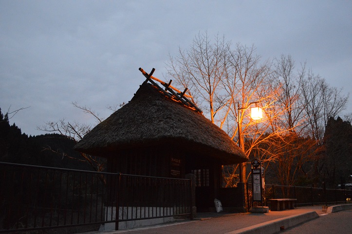 昨日の「-6℃」に比べて随分と感じる寒さが違います。 (早朝の黒川温泉バス停)